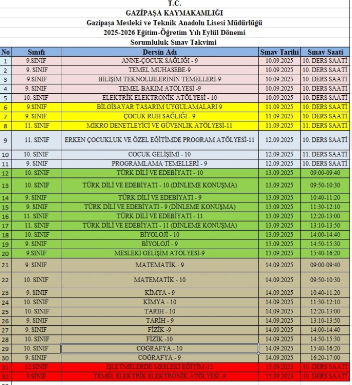 2025-2026 Eğitim Öğretim Yılı Eylül Dönemi Sorumluluk Sınavları